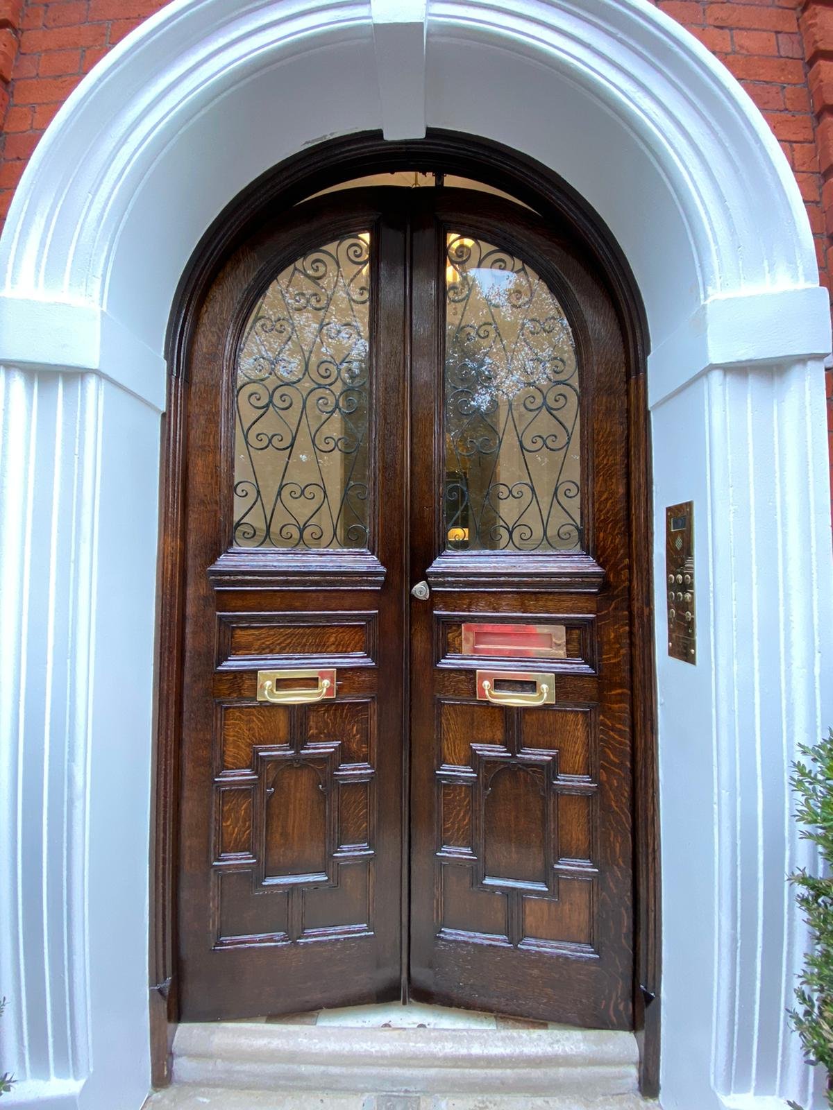 External timber doors restored using weather-resistant lacquers, protecting against UV fading and rain.