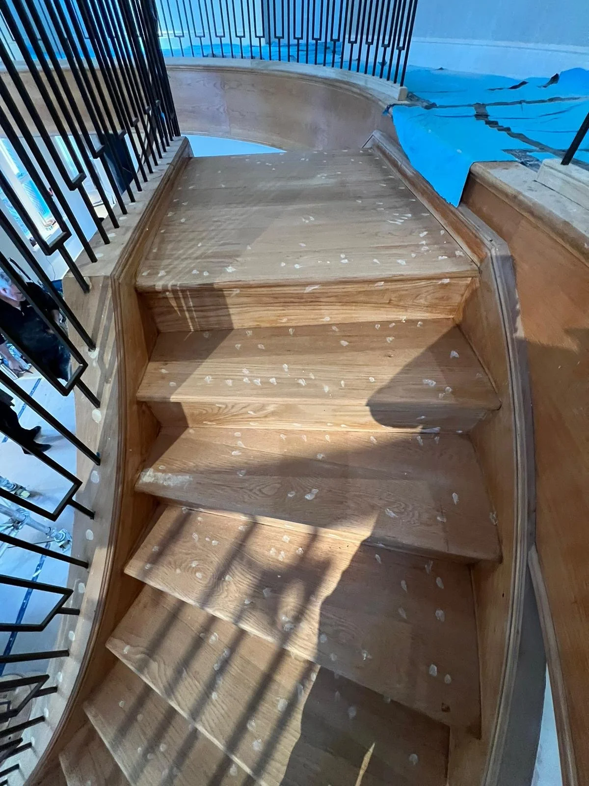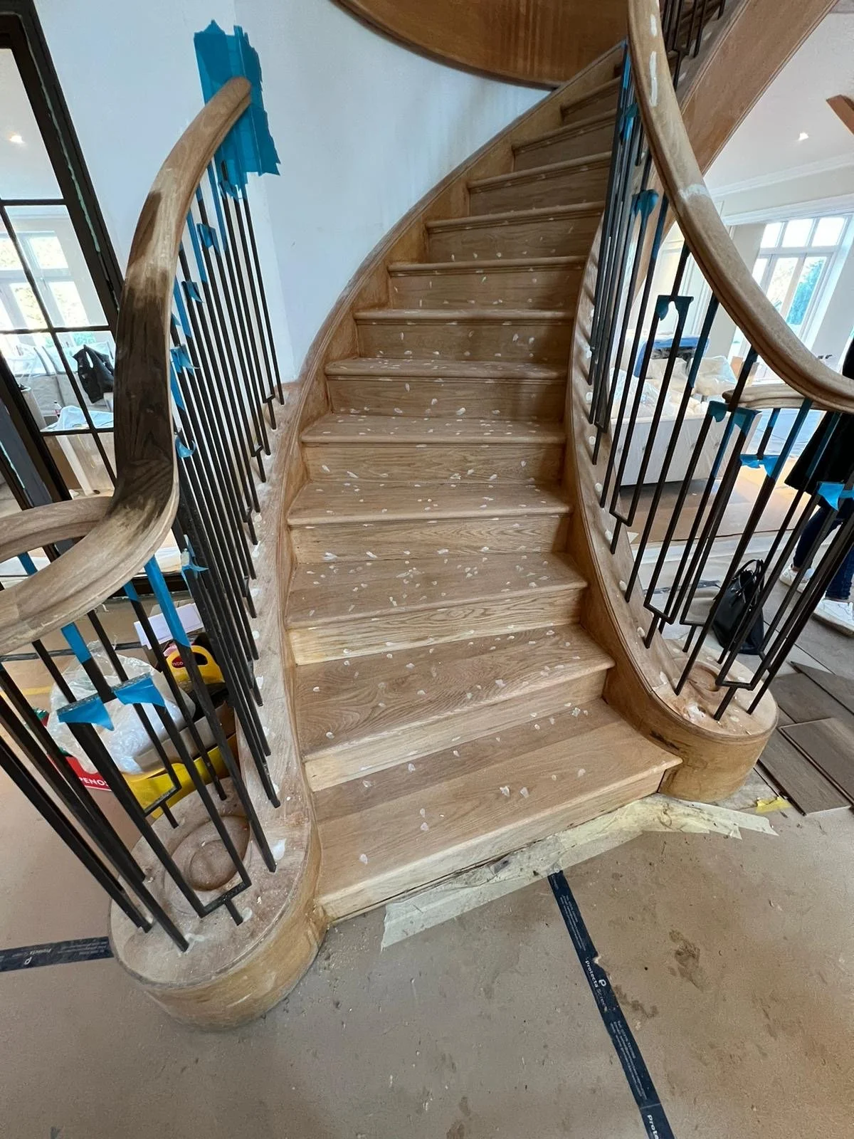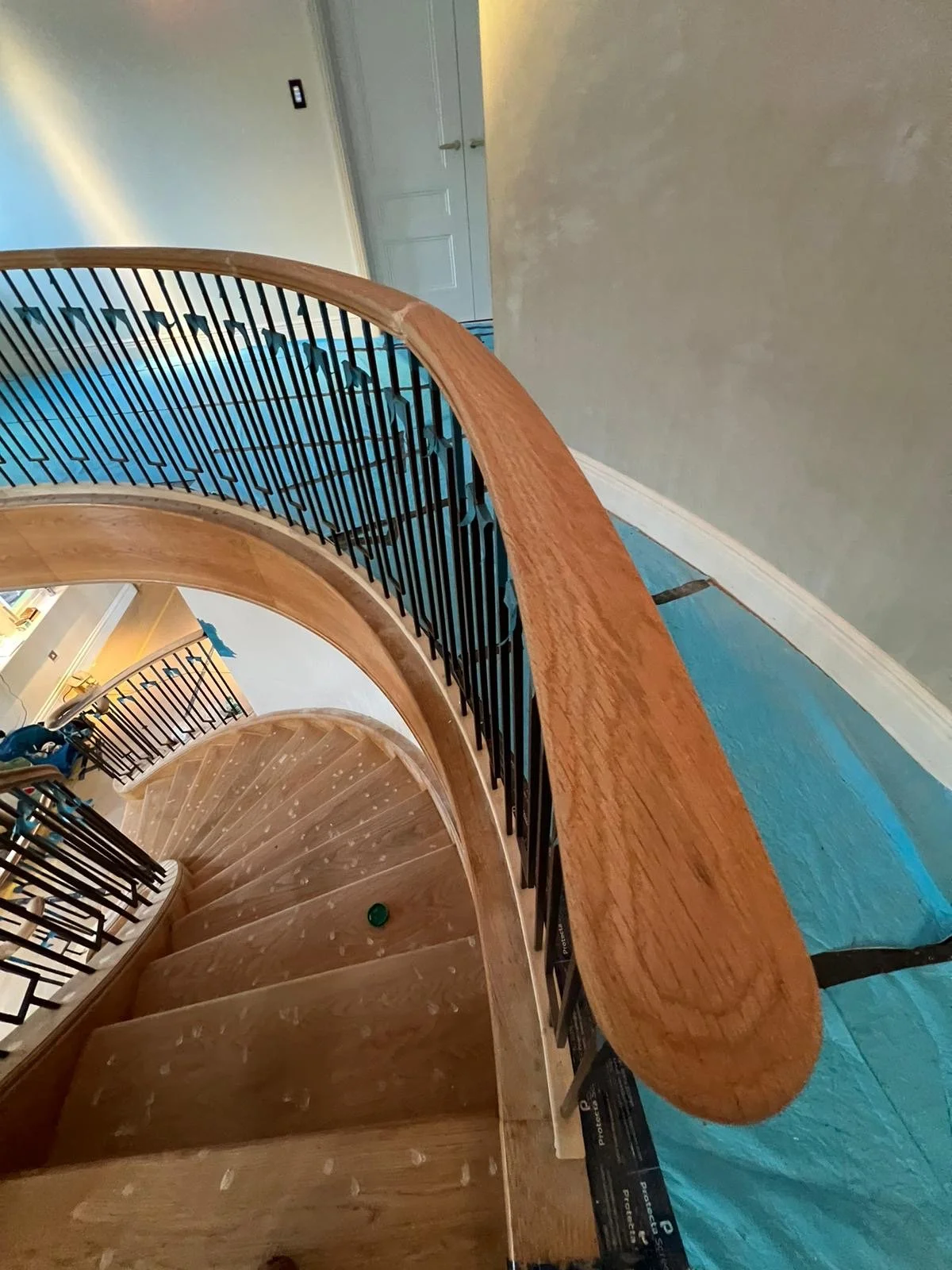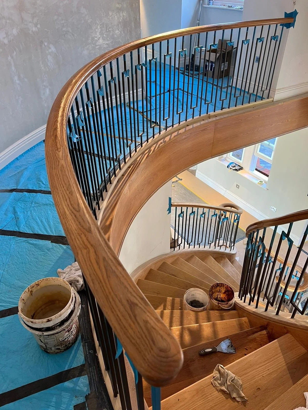 When Sara Agar Interiors approached us to transform the staircase in a grand Oxfordshire home, we knew it was a project where craftsmanship and attention to detail would make all the difference. The double sweeping staircase, with its elegant gallery landing, had originally been carpeted, so our first task was meticulous preparation: filling every pinhole and ensuring the wood was perfectly ready to take its new finish.