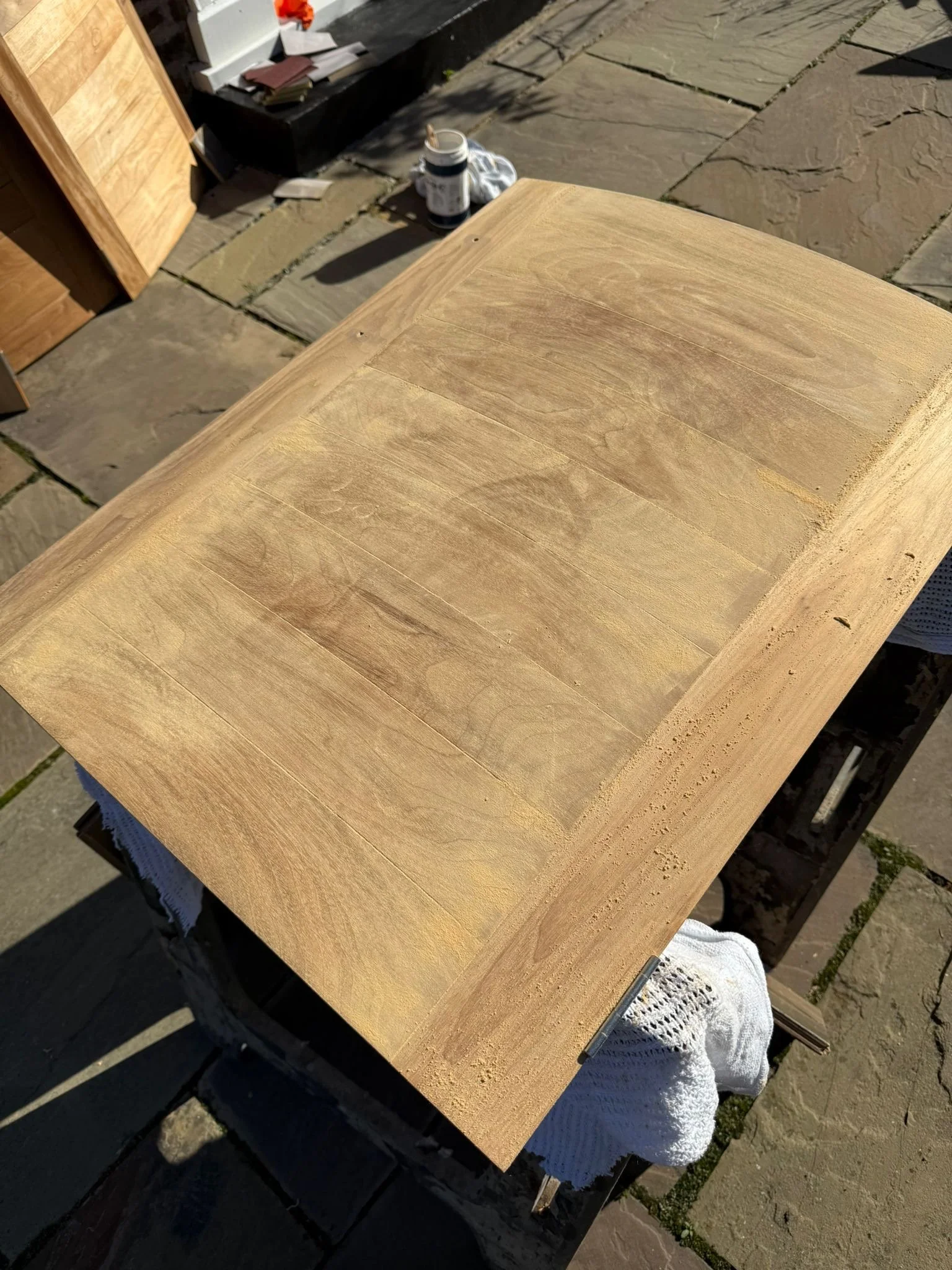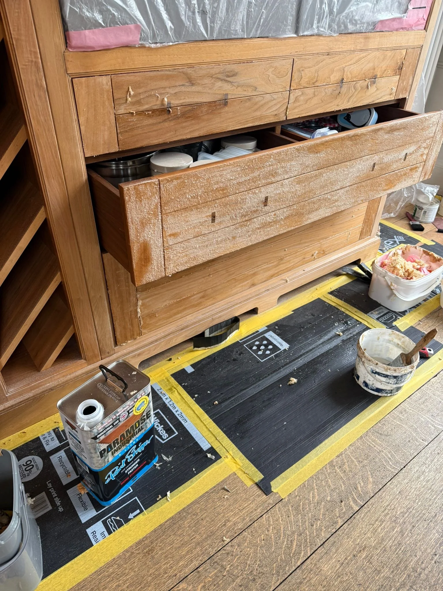 The first step in the process was to remove the original acid-catalyst finish. We carefully stripped this away using a chemical solution, allowing us to reach the natural walnut beneath and create a clean, even foundation for the refinishing work. Once stripped, every surface was hand-sanded — a meticulous process that allows our polishers to feel the texture and grain of the timber, ensuring a smooth and consistent base for colour application.