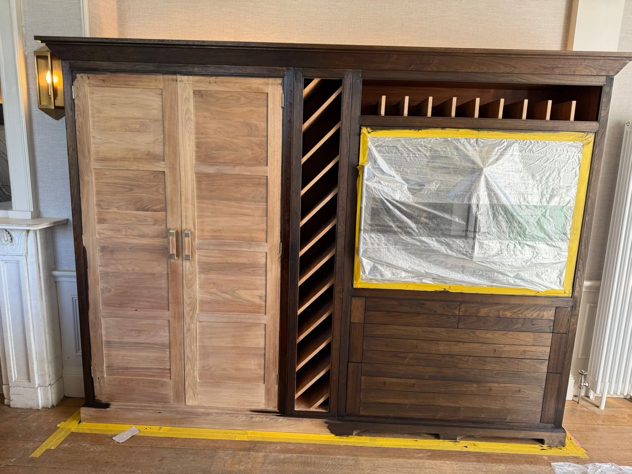With the surfaces prepared, we began building up the walnut tones layer by layer. This process involves carefully blending shades to enhance the natural depth of the wood, creating a finish that feels rich, warm, and full of life. It’s a true craft — balancing precision and artistry to achieve a tone that looks both timeless and contemporary.